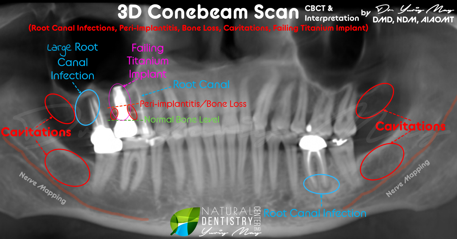 Below is the scan of a typical Natural Dentistry patient (this is a 3D Scan that is exported into 2D format ONLY for illustrative purposes – it is housed on the server and accessed by Dr. Yuriy May in 3D format for all clinical purposes) The importance of getting a 3D Conebeam scan cannot be overstated, as it is the only diagnostic tool to identify root canal infections, titanium implant failures, dental cavitations, sinus abnormalities, abnormal bone grafts and other pathological processes which CANNOT be identified on xrays, PAs or 2D panos.