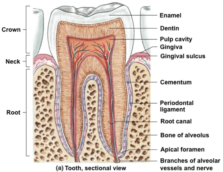 - A tooth is made up of several components (See Image right: (a) Tooth, sectional view) with both the dentin and enamel being permeable, comprised of millions of microtubules that allow serum, microorganisms, nutrients, and cellular debris to pass through them. Remember: a tooth is not like glass (non-permeable), quite the opposite, it’s like a paper towel, or better said, it is like all the other structures in our body, completely permeable. This means that microbes, pathogens, nutrients, serum, and molecules all easily pass throughout dental tubules and tooth structure – whether the canals are filled with gunk from an endodontist or have their original nerve and pulp inside. Teeth are permeable, whether root canaled or not.